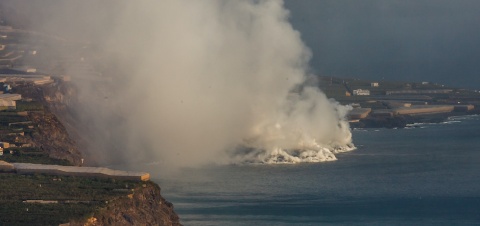 La lava del volcán de La Palma ha comenzado a ganarle terreno al mar hasta formar un delta de unos 500 metros de ancho y, de momento, el viento mantiene alejada de la costa la columna de vapor de agua y de gases posiblemente tóxicos generada por el contacto entre el magma y el océano.