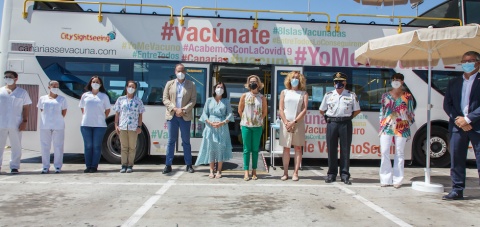 La ministra de Sanidad, Carolina Darias, realizó hoy una visita a uno de los dispositivos itinerantes de vacunación frente a la COVID-19 del Servicio Canario de Salud, conocidos como ‘vacuguaguas’, que este viernes está estacionado en el parking del Centro Comercial El Tablero.
