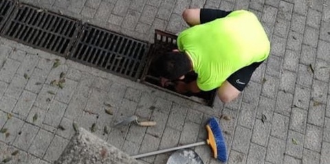 Si el Lunes ventilábamos cómo los vecinos de Maspalomas sellaban los alcantarillados con cinta americana para que no salieran las cucarachas, hartos de las plagas, hoy nos encontramos con este vecino de Fataga que limpia los bajantes de la plaza.