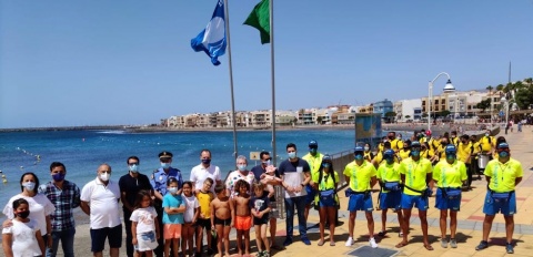 La Playa de Arinaga luce desde este sábado, por quinto verano consecutivo, la bandera azul otorgada por la Fundación Europea de Educación Ambiental, un emblema que reconoce la limpieza y calidad de las aguas, la gestión medioambiental, la seguridad de las zonas de baño y los servicios públicos que se encuentran a disposición de la población. El alcalde de Agüimes, Óscar Hernández, procedió al izado de la enseña, que ya ondea en un lugar destacado de la Avenida de Los Pescadores, en la zona de Los Barquillos, una de las más concurridas de Playa de Arinaga.