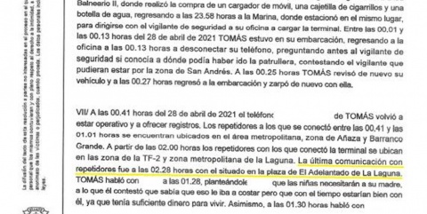 Esta última conexión telefónica, que se correspondería con el último mensaje que envió Tomás Gimeno a las 02:28 de la madrugada desde La Laguna, situaría al padre de las menores, Anna y Olivia, en tierra firme y no en el mar a bordo de su embarcación, cuando se pierde su rastro, tras cometer el presunto homicidio de sus hijas en su vivienda para, posteriormente, arrojar sus cuerpos al mar alrededor de las 22:27 horas de aquella noche, describe el auto judicial.