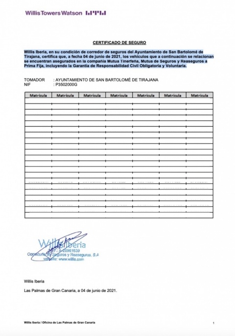 Narváez ha remitido a este diario el certificado en el que Willis Iberia, en su condición de corredor de seguros del Ayuntamiento de San Bartolomé de Tirajana, certifica que, a fecha 04 de junio de 2021, “los vehículos que se relacionan se encuentran asegurados en la compañía Mutua Tinerfeña, Mutua de Seguros y Reaseguros a Prima Fija, incluyendo la Garantía de Responsabilidad Civil Obligatoria y Voluntaria"