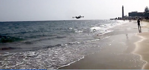 Un hidroavión del 43 Grupo del Ejército del Aire y cuya dependencia operativa es de la Unidad Militar de Emergencias (UME), ha sorprendido y maravillado a los bañistas de la playa de Maspalomas con sus labores de maniobras.