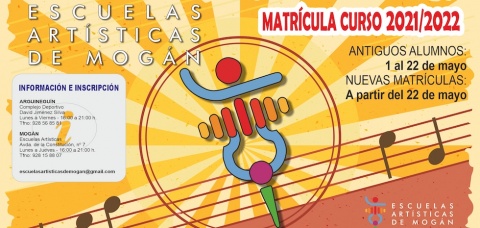 Las personas que deseen continuar su formación en las Escuelas Artísticas de Mogán el próximo curso 2021-2022 pueden realizar la renovación de matrícula hasta el próximo 22 de mayo. A partir de esta fecha también abrirá el plazo de inscripción para aquellas que por primera vez quieran iniciarse en alguna de las disciplinas artísticas que se imparten a través de este servicio municipal.
