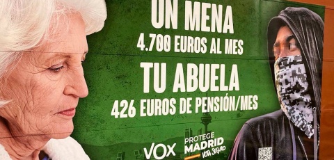 Fuentes fiscales han confirmado a EFE que actuarán por iniciativa propia contra este cartel, instalado en instalaciones de Cercanías de la Puerta del Sol, en el que se ve en un lado a una anciana y en el otro a un niño de origen migrante. "Un mena 4.700 euros al mes, tu abuela 426 euros de pensión/mes", se lee en el cartel junto al lema de Vox 'Protege Madrid, vota seguro'.