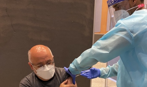 El presidente del Cabildo de Gran Canaria, Antonio Morales, ha recibido este miércoles la primera dosis de la vacuna contra la covid-19, en el Palacio de ExpoMeloneras, en Maspalomas.