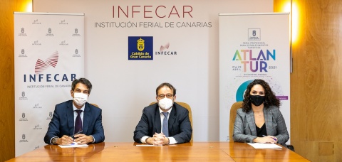 “Atlantur se desplaza para buscar la cercanía con un sector que ha sido duramente golpeado por la pandemia”, afirmó el coordinador de Desarrollo Económico del Cabildo, Raúl García Brink, tras firmar el convenio con el director de eventos de Lopesan, Zoilo Alemán, quienes junto a la directora de Infecar, Natalia Santana, celebraron esta unión de lo público y privado para una cita más comprometida que nunca con la recuperación del turismo.