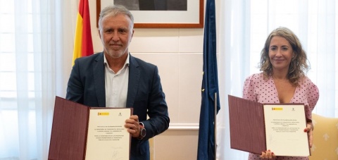El presidente del Gobierno de Canarias, Ángel Víctor Torres, y su consejero de Transportes, Sebastián Franquis, han rubricado este lunes en Madrid, junto con la ministra Transportes, Movilidad y Agenda Urbana, Raquel Sánchez, el protocolo de colaboración para coordinar la aplicación de las medidas transitorias de ayudas al transporte público regular y terrestre en Canarias, elevando al 50 % el descuento en los abonos y títulos multiviaje.